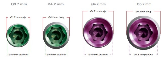Estos implantes análogos se venden en un empaque de cinco y son compatibles con Zimmer Screw-Vent, Branemark System RP, Straumann Bone Level, Biomet 3i Certain, Nobel Replace y Nobel Active. Los tornillos también vienen en un empaque de cinco para compatibilidad con las mismas marcas.