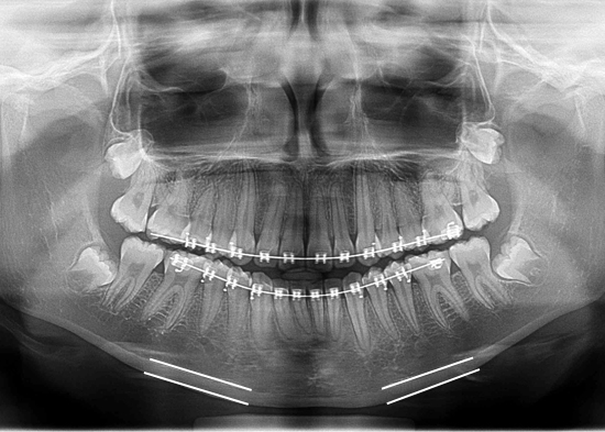 En muchas ocasiones, al observar en una radiografía panorámica la cortical mandibular esta puede estar disminuida en su grosor, lo cual indica una disminución de la densidad mineral ósea a nivel de los maxilares del paciente y por ende, un signo de osteoporosis.