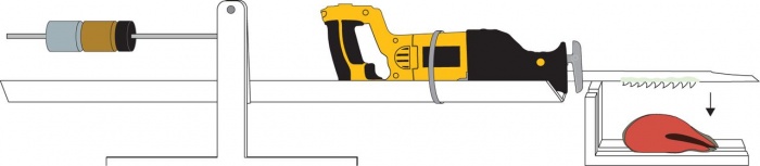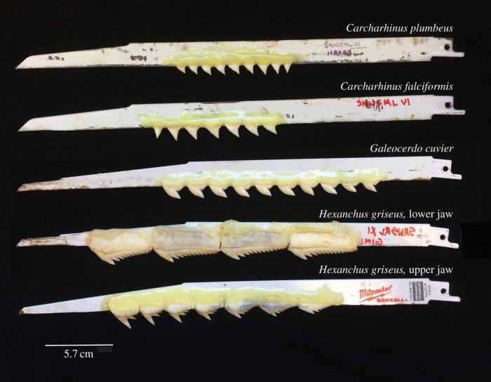 Sierras fabricadas con dientes de tiburones.Los dientes para este estudio fueron obtenidos en su mayoría de especímenes secos o congelados, colecciones y dientes perdidos encontrados en el océano. A continuación, los dientes fueron pegados en columna a la hoja de una sierra. La sierra eléctrica fue calibrada en un marco para regular la presión que se aplica para que las cuchillas se hundan en la "presa".