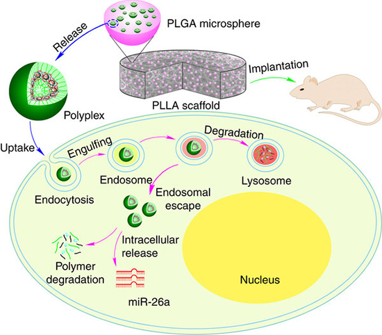 Cuando entran en contacto con las células madres presentes en la zona, el microARN las dirige a cambiar a su mecanismo de reparación y regeneración ósea, explica el Dr. Pete Ma, Prof. de la Facultad de Odontología, y director principal del proyecto. Es difícil para el microRNA penetrar en la célula, dice el Pro. Peter, sin embargo, la esfera de polímero desarrollada, le permite a la molécula fácilmente entrar a la célula e inducir la reparación ósea.