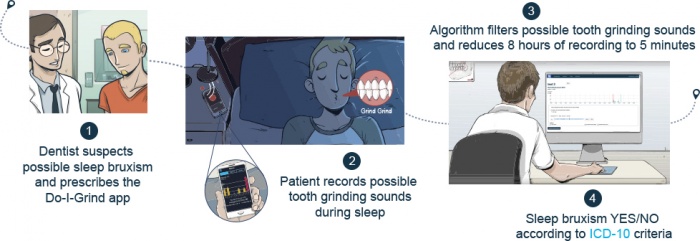 De igual forma comentó "Se pueden monitorear pacientes usando la DolGrind App para ver si hay un bruxismo activo o si es crónico. Nuestro Bruxsticker hace posible identificar si se producen movimientos mandibulares durante el sueño. El nano-acelerómetro y un Bluetooth chip, en combinación con nuestra App, registra y filtra los sonidos realizados en el bruxismo durante varias noches".
