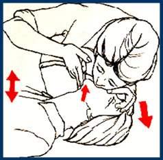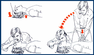 Si se decide realizar la respiración boca a boca debemos cerrar suavemente las fosas nasales del paciente con el dedo índice y el pulgar de la mano con la cual se mantiene la extensión de la cabeza. Colocar la boca sobre la del paciente y administrar en inicio 2 insuflaciones lentas, debemos observar si el pecho se levanta. Si no se levanta se repite la maniobra para liberar la vía aérea.