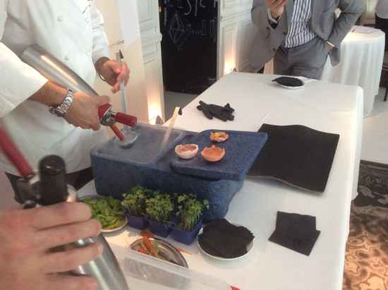 El próximo platillo fue Cromatismo naranja, con pan ácido, queso Chédar y zanahoria salteada. Si al poder del queso Chédar para absorber el mal aliento (por la capacidad que tiene la grasa que lo compone de contrarrestar el ácido de las comidas), le sumamos la zanahoria, el resultado es una sabrosa limpieza bucal con el toque refrescante del cromatismo naranja, describe el Dr. Malagón.